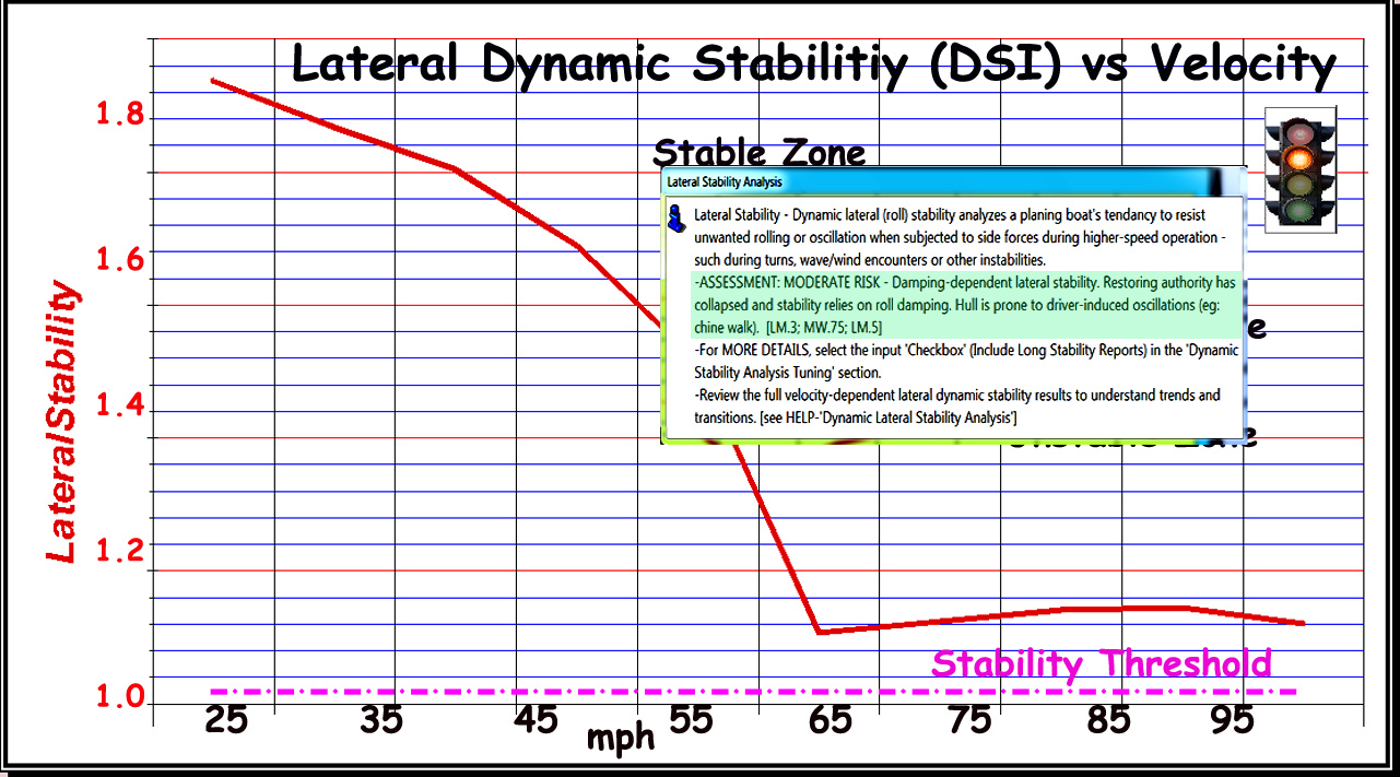 Making it Easy: For each of the Stability measures, the software does ALL the work behind the scenes, and gives both DETAILS and also gives the 'GOOD/NO GOOD' summary of all considerations. These unique presentation formats are displayed for: •Longitudinal Dynamic Stability Analysis (LongStab Index) •Lateral Stability Analysis (LatStab Index) •Porpoising Analysis (xPorpoise Index) In the TBDP©/VBDP© Stability analysis, we examine the absolute values of these indicators, rate-of-change (derivative) of the indicators, local trending and global trending of the indicator - all toward identifying the real-world status of lateral dynamic stability. Here's How we Do