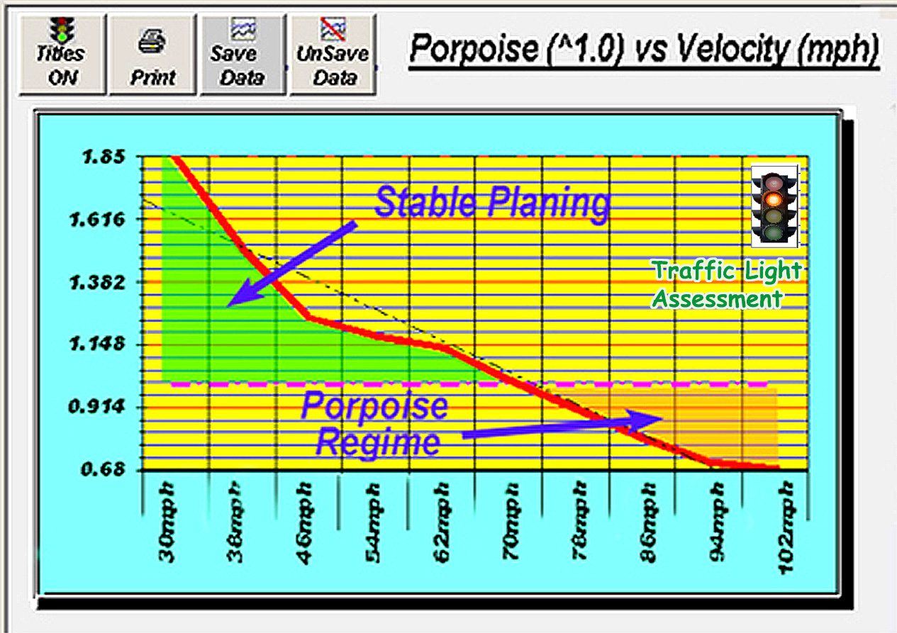![]() Figure 1- TBDP©/VBDP© graphic output shows the velocity at which your hull configuration experiences instability in Porpoise Regime and susceptibility to porpoising. |